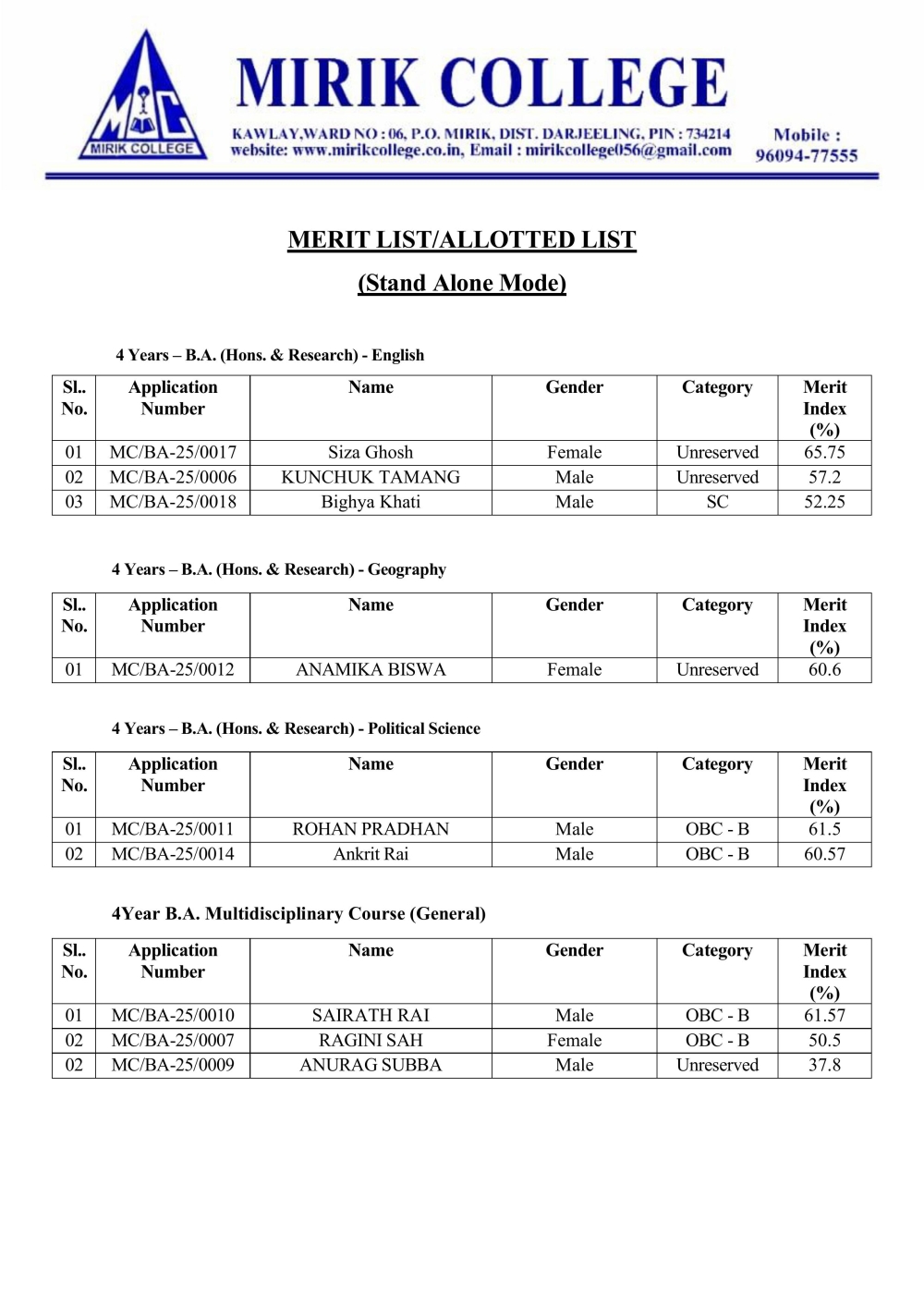 Notice for Merit List / Allotted List (Standalone Mode) for the academic session 2025-26