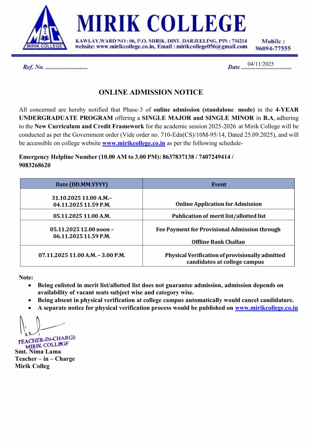 Notice for Online Admission (Standalone Mode) for the academic session 2025-26