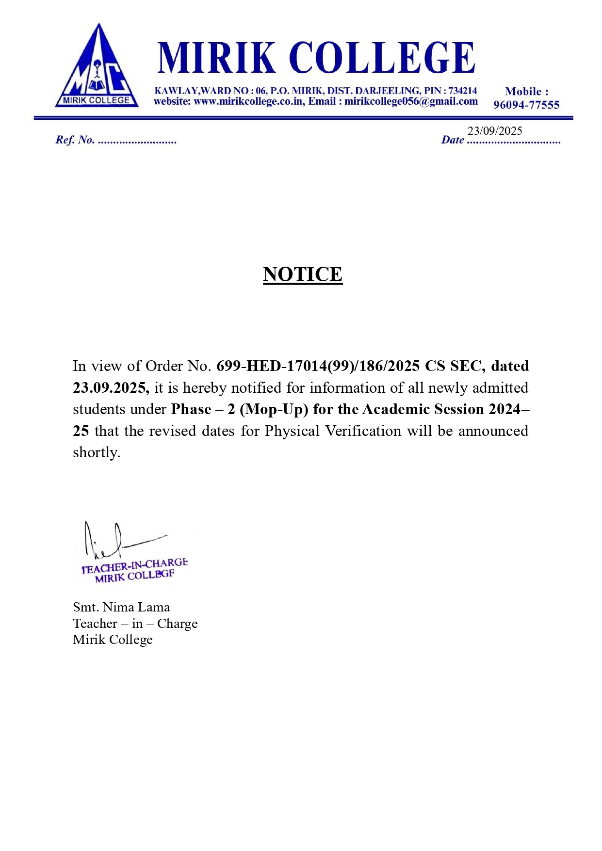Notice for the information of all newly admitted studetns under Phase - 2 (Mop-Up) for the Academic Session 2024-25 that the revised date for Physical Verification will be announced