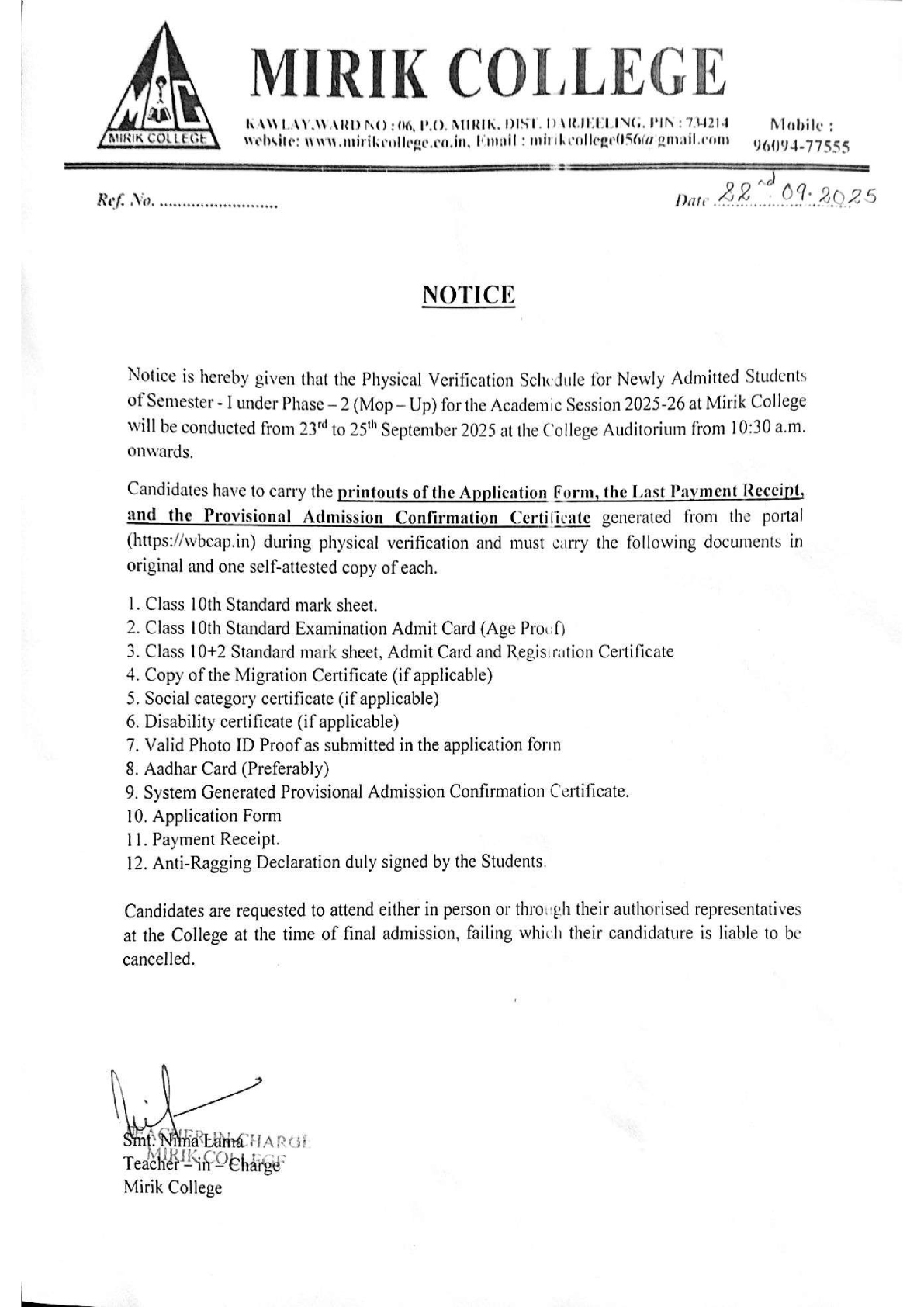 Notice for the Physical Verification Schedule for Newly Admitted Students for the Academic Session 2025-26